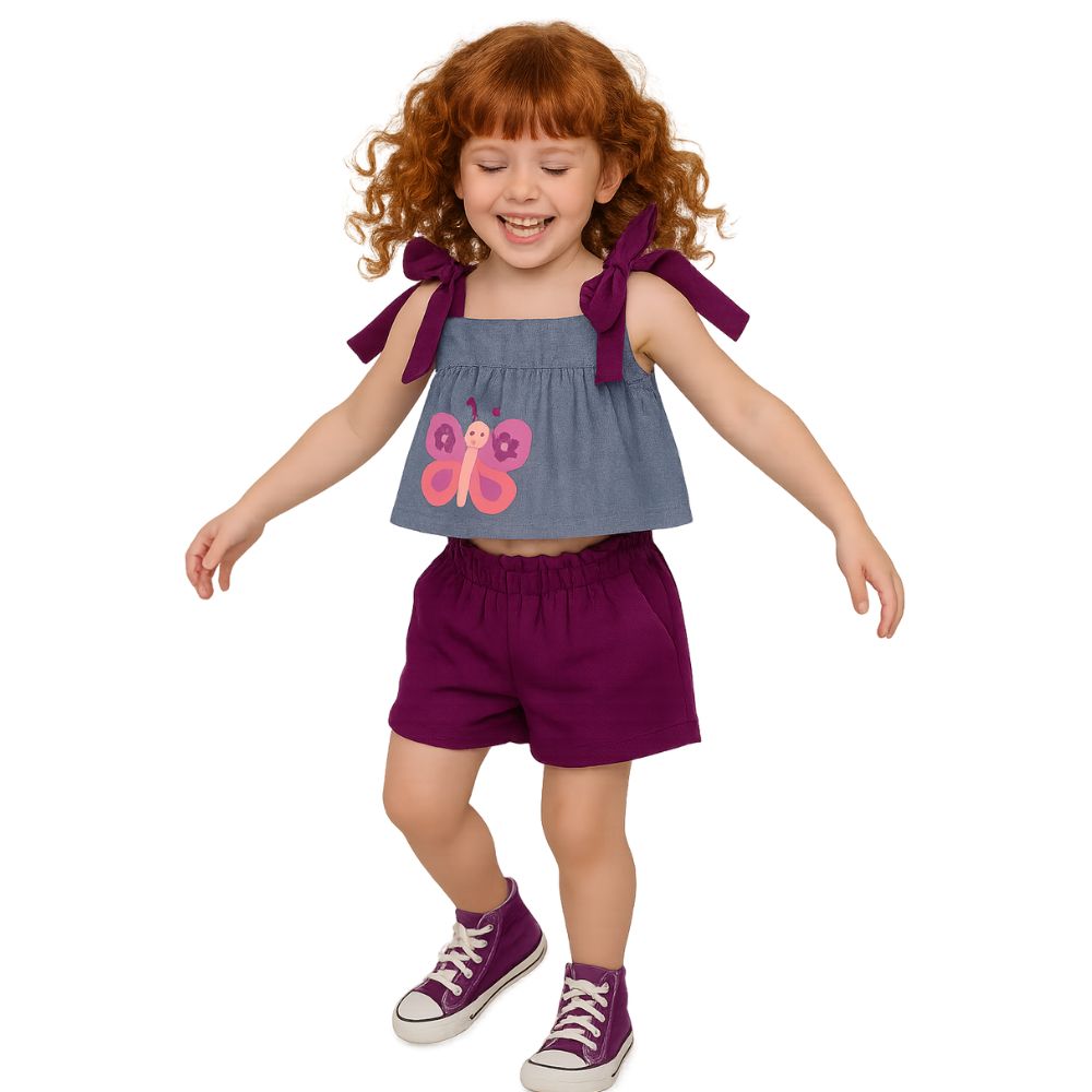 Conjunto infantil super fofo com blusinha jeans leve e estampa de borboleta, combinado com short roxo.