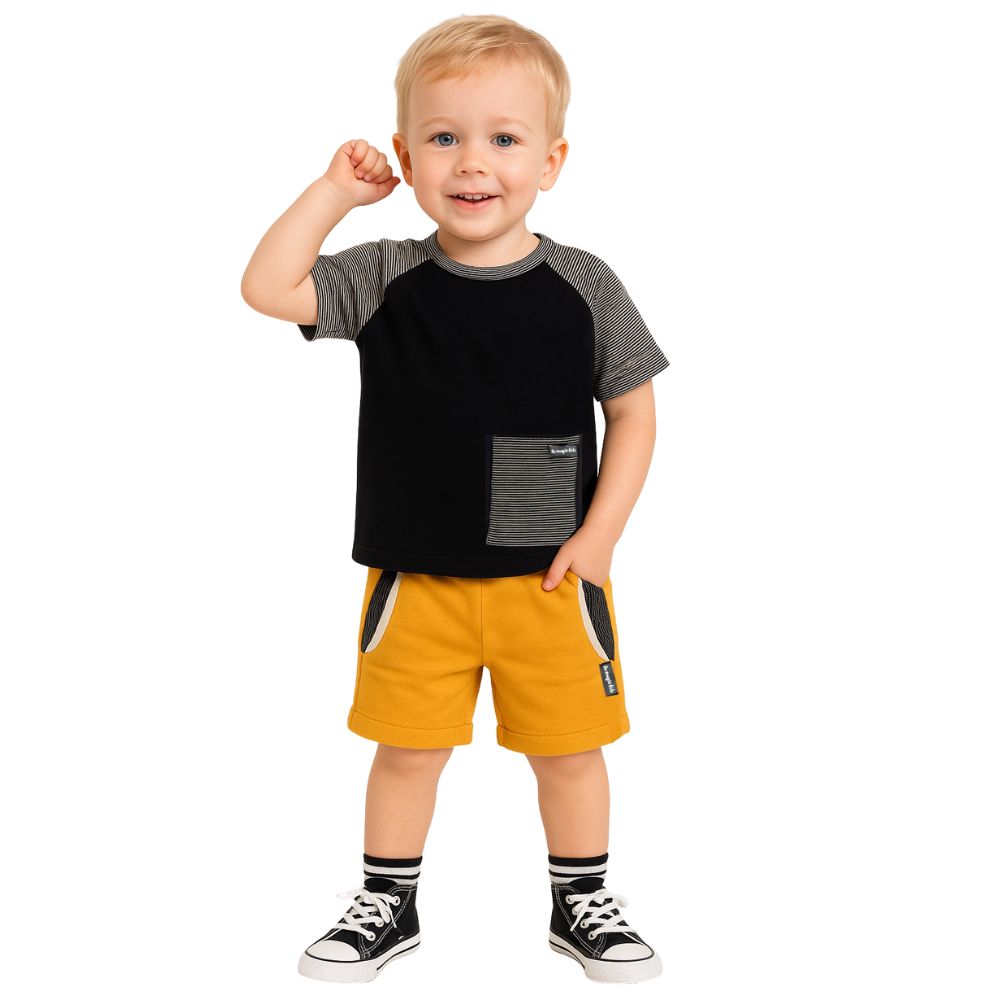 Conjunto infantil moderno e confortável, com camiseta em malha de algodão preta com detalhe listrado e bolsinho frontal, combinando com bermuda mostarda com recortes contrastantes e bolsos funcionais. Estilo e liberdade para brincar com conforto o dia todo!Camiseta em malha de algodão com bolso decorativo;