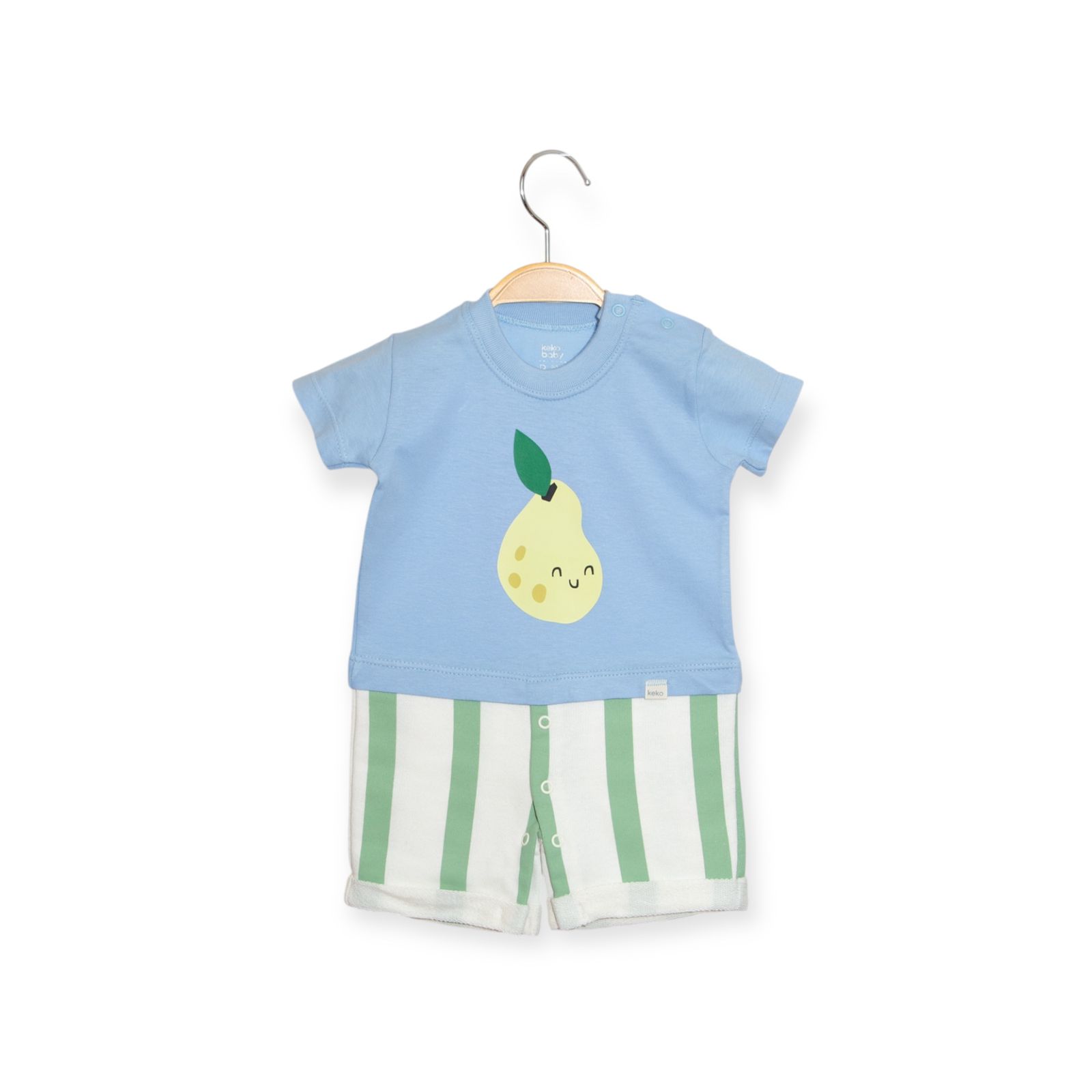 Conjunto Infantil Camiseta Azul com Estampa de Pera + Short Listrado