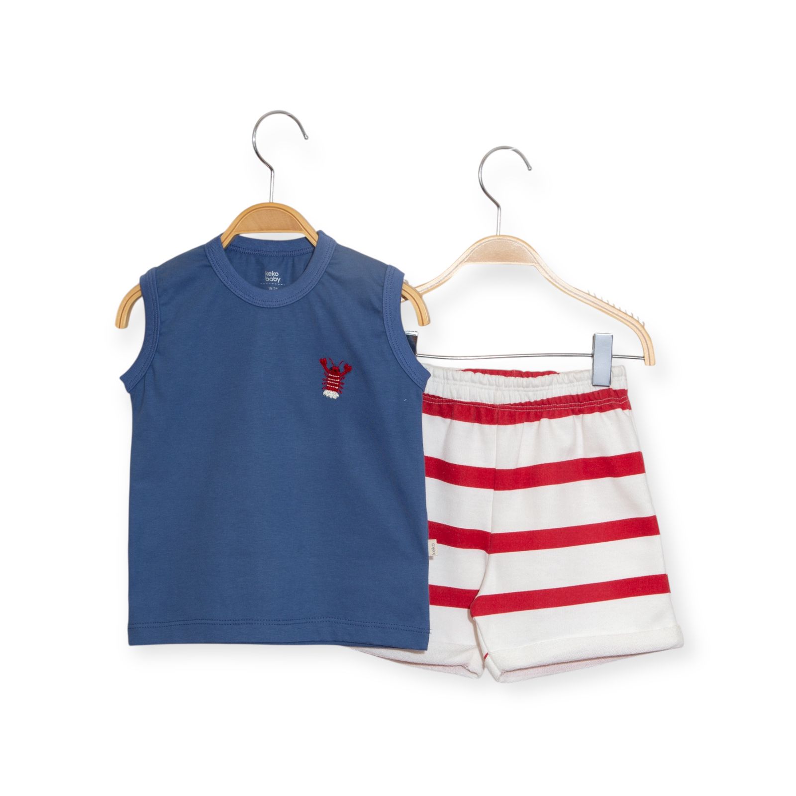 Um look fresquinho e divertido para acompanhar os pequenos nos dias de sol! A regata azul marinho traz bordado delicado de lagosta, dando um toque lúdico e temático. O short com listras horizontais vermelhas e brancas complementa o visual com estilo náutico e descontraído.