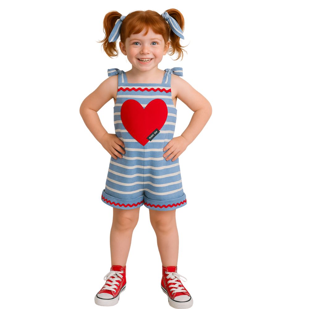 Macacão infantil com listras azul e branco e coração vermelho em destaque. Um look alegre, confortável e cheio de amor para as pequenas arrasarem!!Um look que transborda amor! ❤️