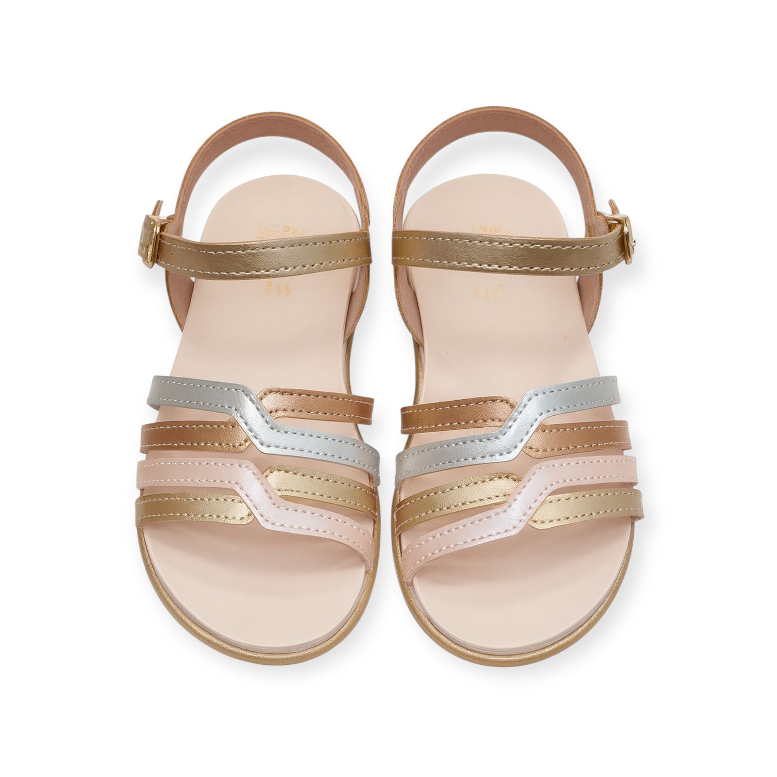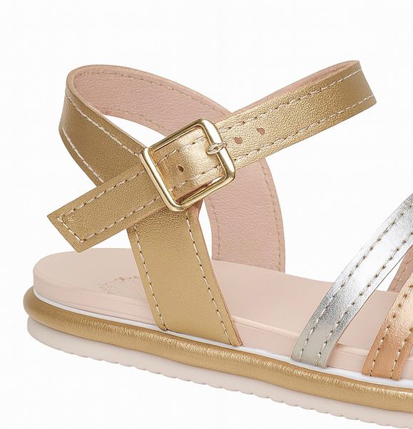 Uma sandália delicada, com tiras metálicas em dourado, prata e rosê, perfeita para compor looks do dia a dia ou ocasiões especiais.