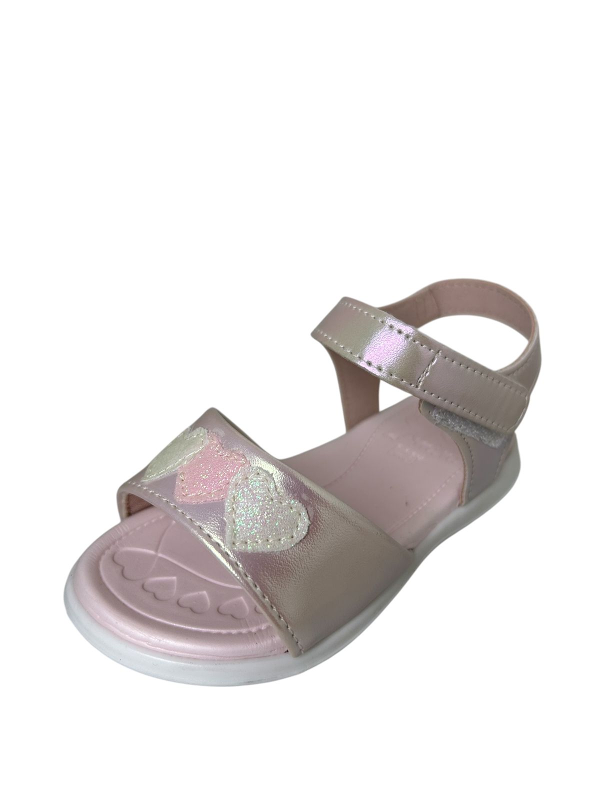 Design encantador: Sandália em tom rosé com aplicação de corações brilhantes em glitter, que trazem charme e delicadeza.