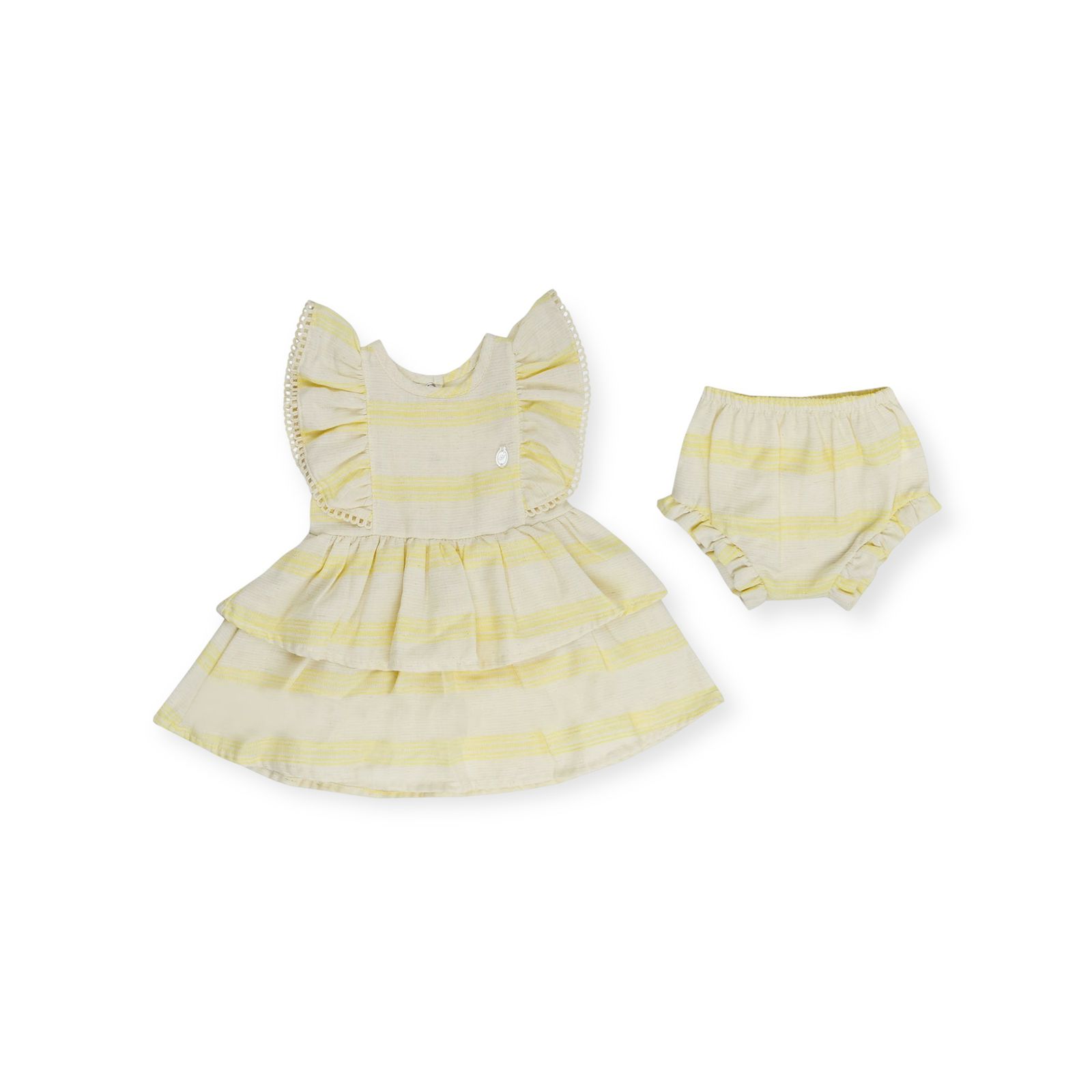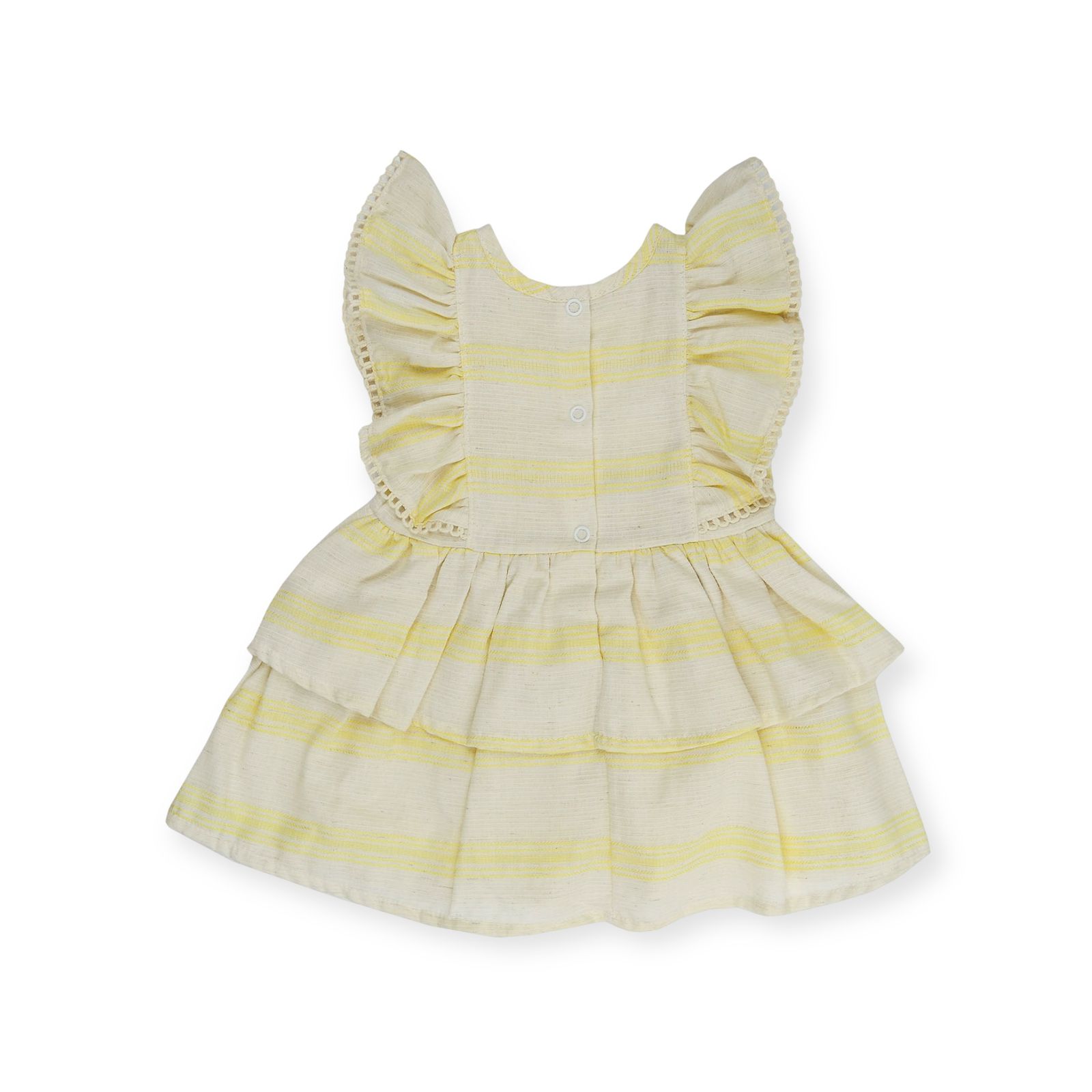 Esse vestido infantil é perfeito para ocasiões especiais ou até para um passeio casual mais arrumadinho. Ele é confeccionado em tecido leve com listras suaves em tons de amarelo e bege, que dão um ar delicado e elegante. O detalhe das mangas com babados e acabamento rendado nas bordas traz um toque romântico, enquanto a saia em camadas dá volume e movimento à peça.