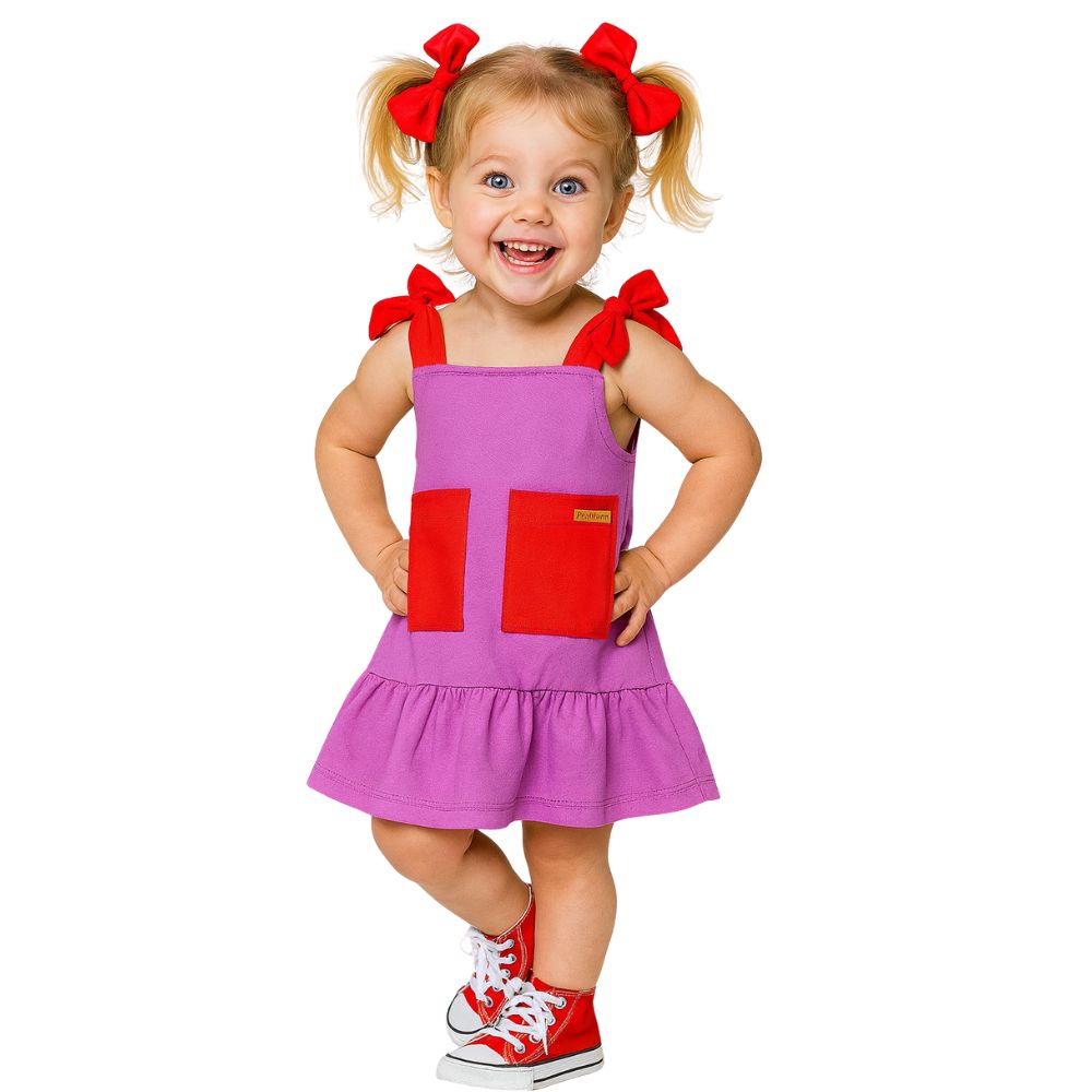 Com alcinhas de amarrar, bolsos vermelhos na frente e babado na barra, ele é perfeito para os dias de sol, passeios e momentos de muita diversão!