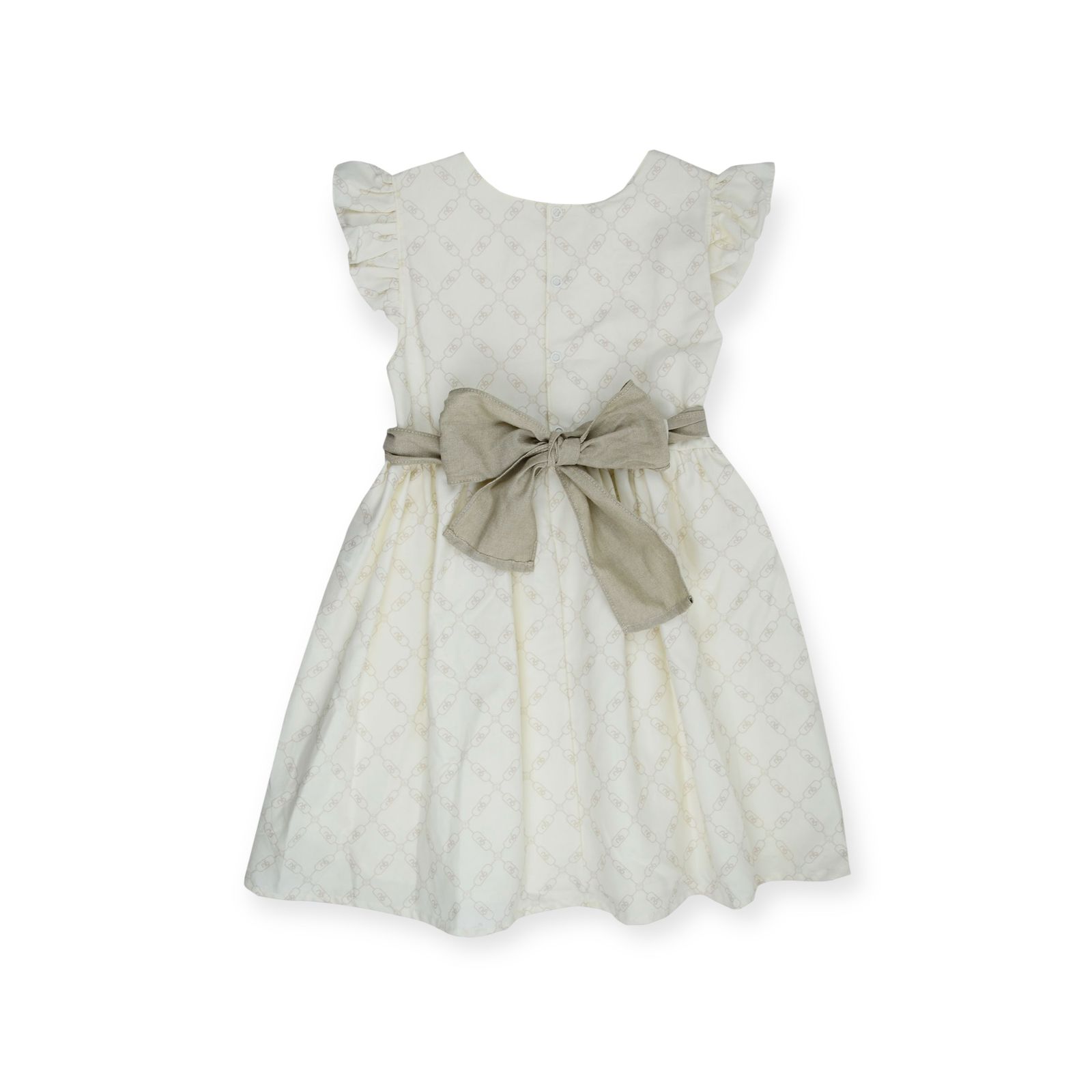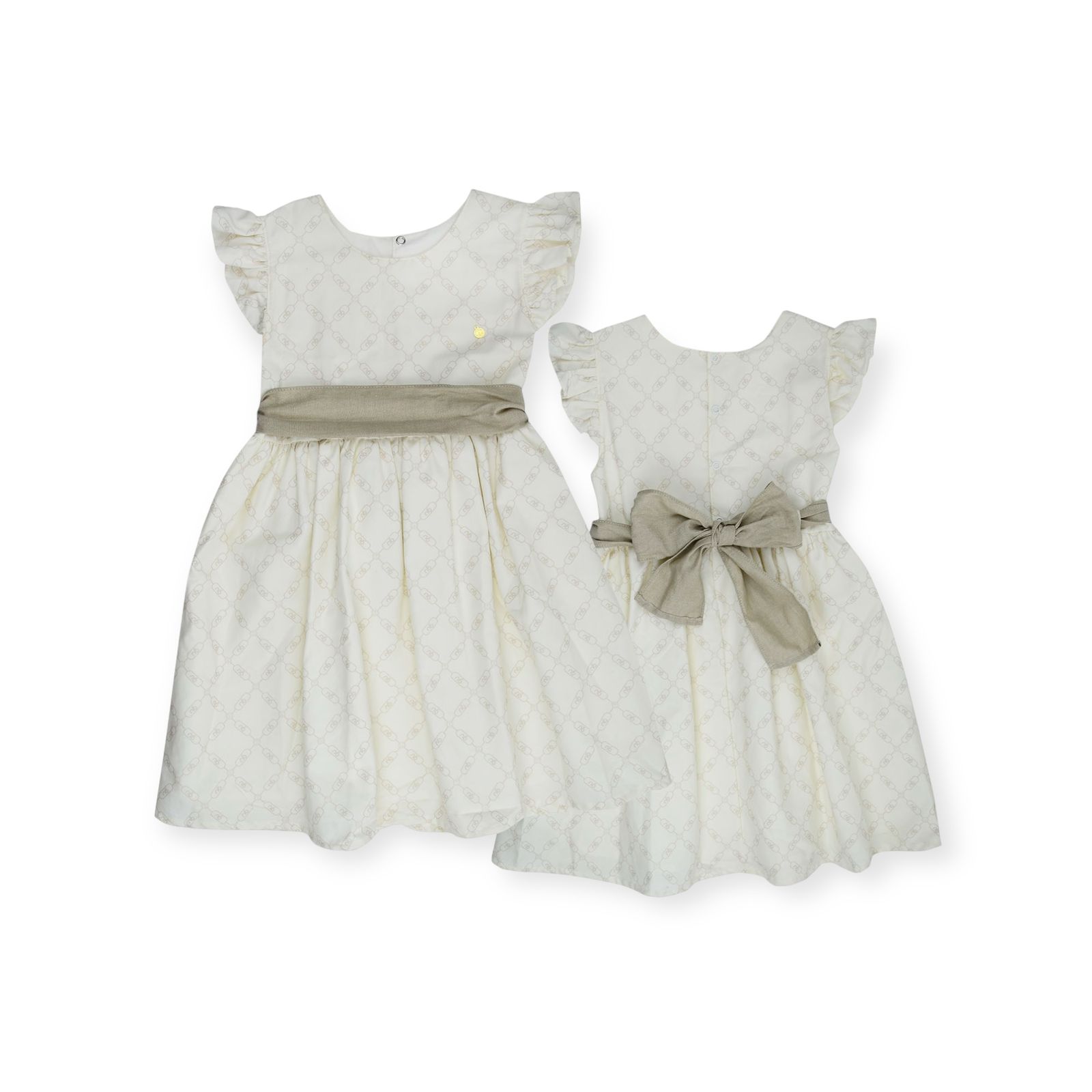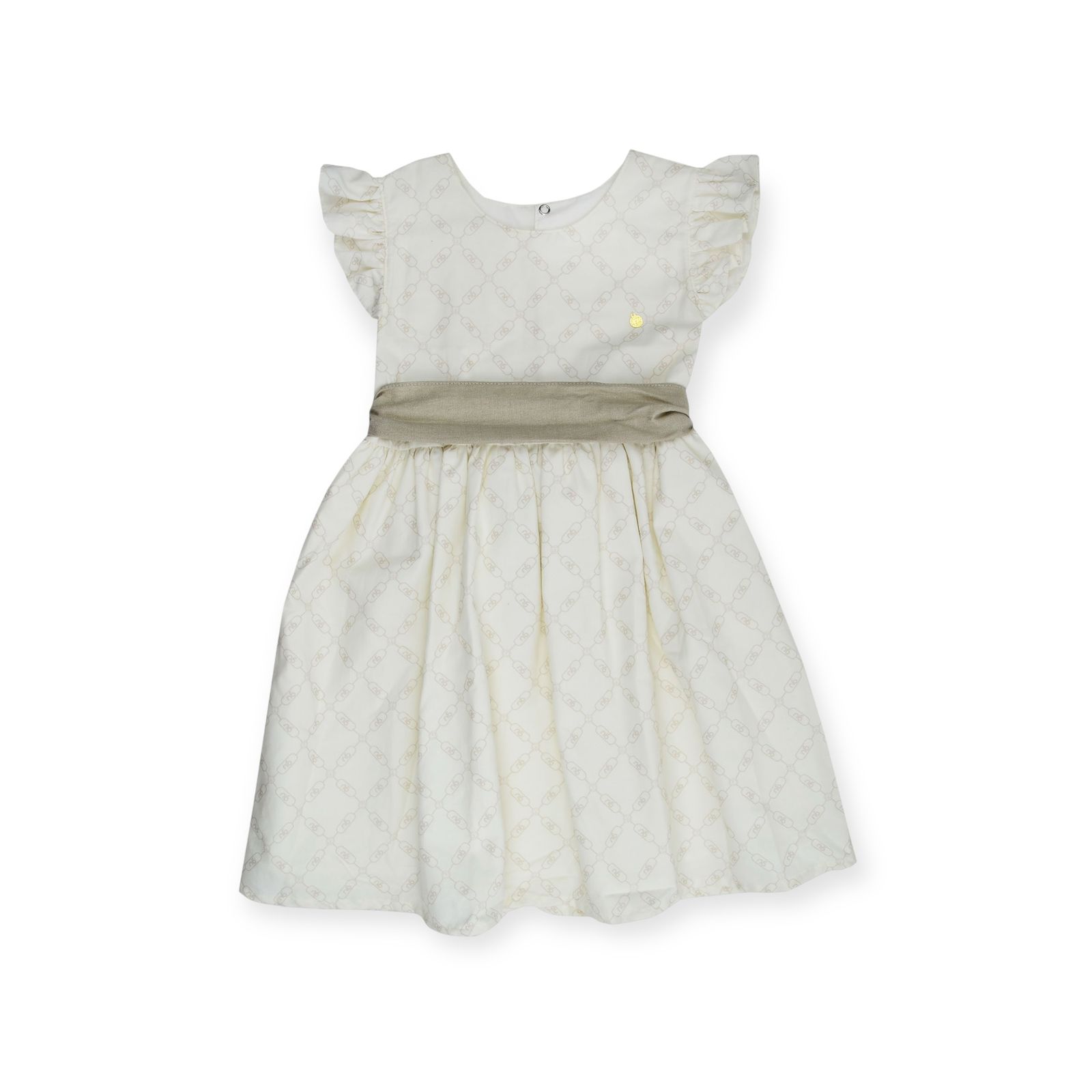 : Esse vestido infantil é um verdadeiro charme para ocasiões especiais! Ele é confeccionado em tecido leve com estampa discreta em tom bege claro e detalhe de faixa de cintura em tecido acetinado na cor dourado queimado, que se transforma em um laço elegante nas costas.
